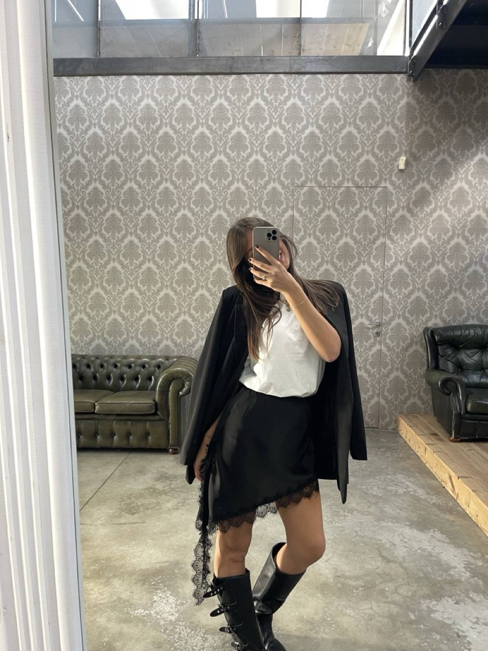 Asymmetrical lace-trim skirt.