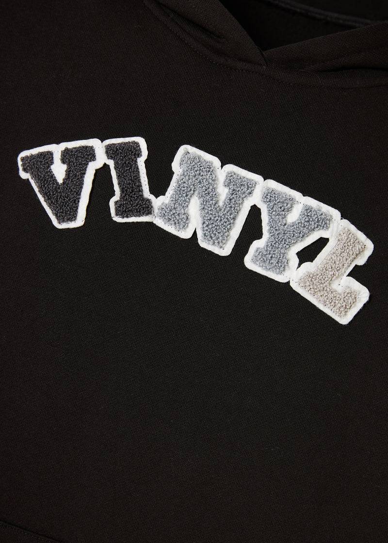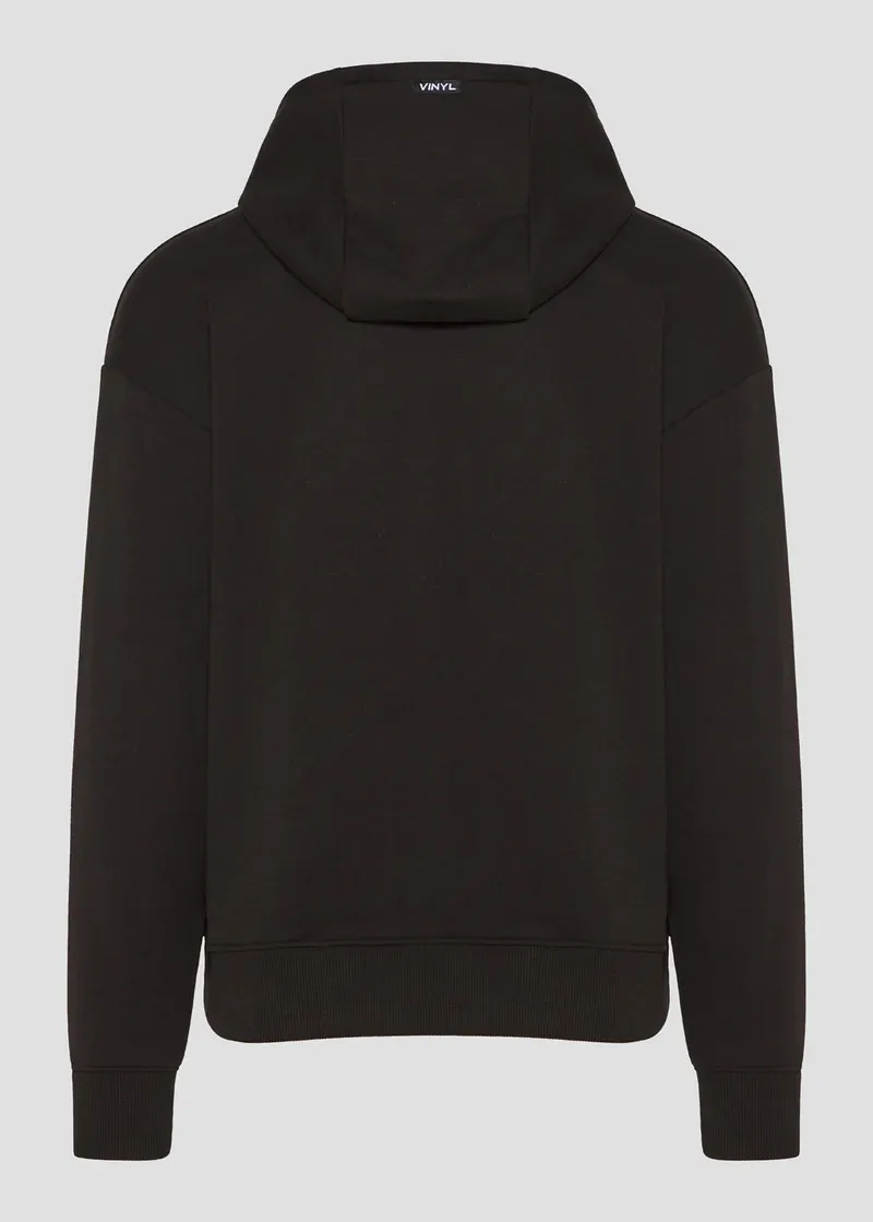 Vinyl hoodie with fluffy patch. With kangaroo pockets and ribbed hem.