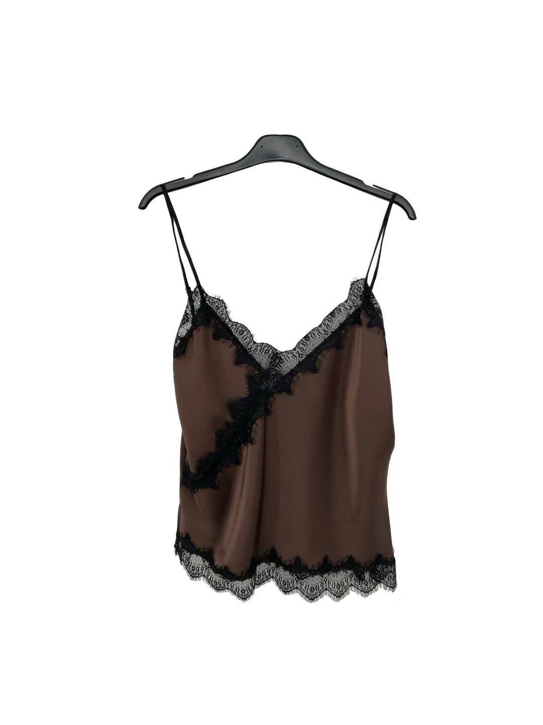 Satin Lace Trim Cami Top - Brown