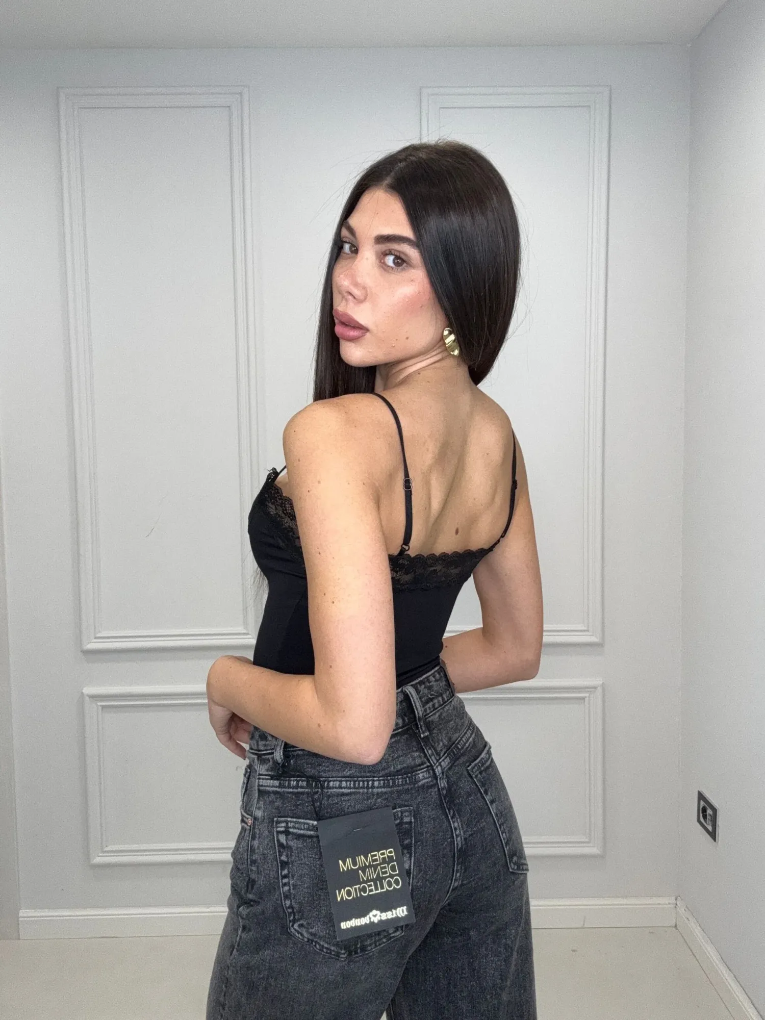 Lace Trim Spaghetti Strap Bodysuit - Black