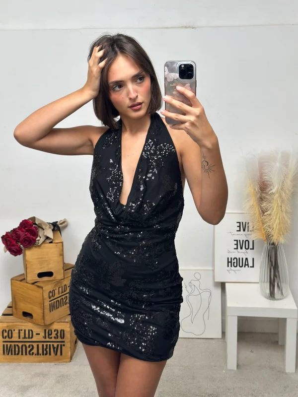 Sequin Open Back Mini Dress with Flared Sleeves – Black