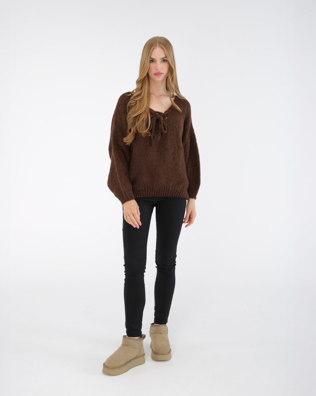 Knit Sweater with Lace-Up Neckline – Brown