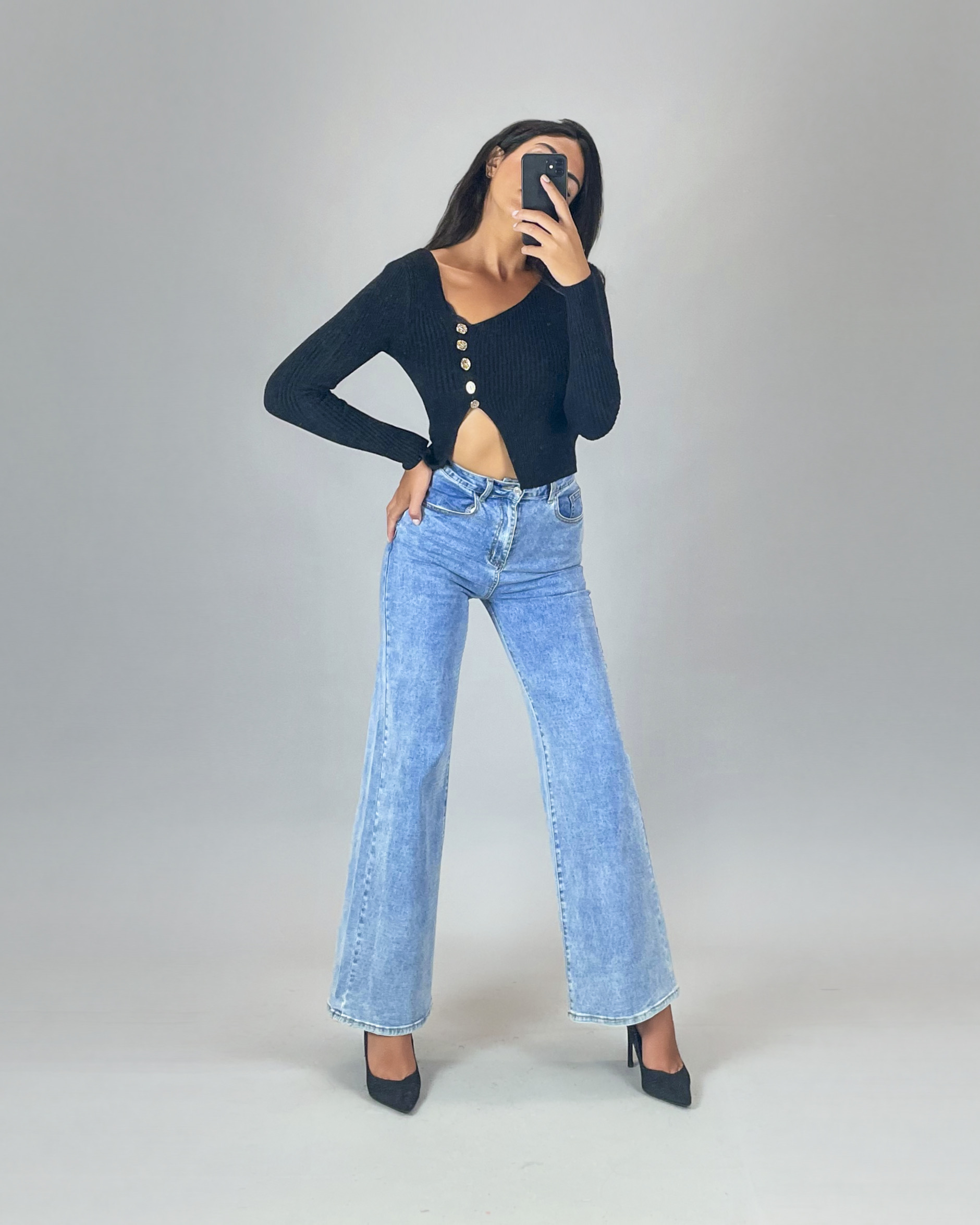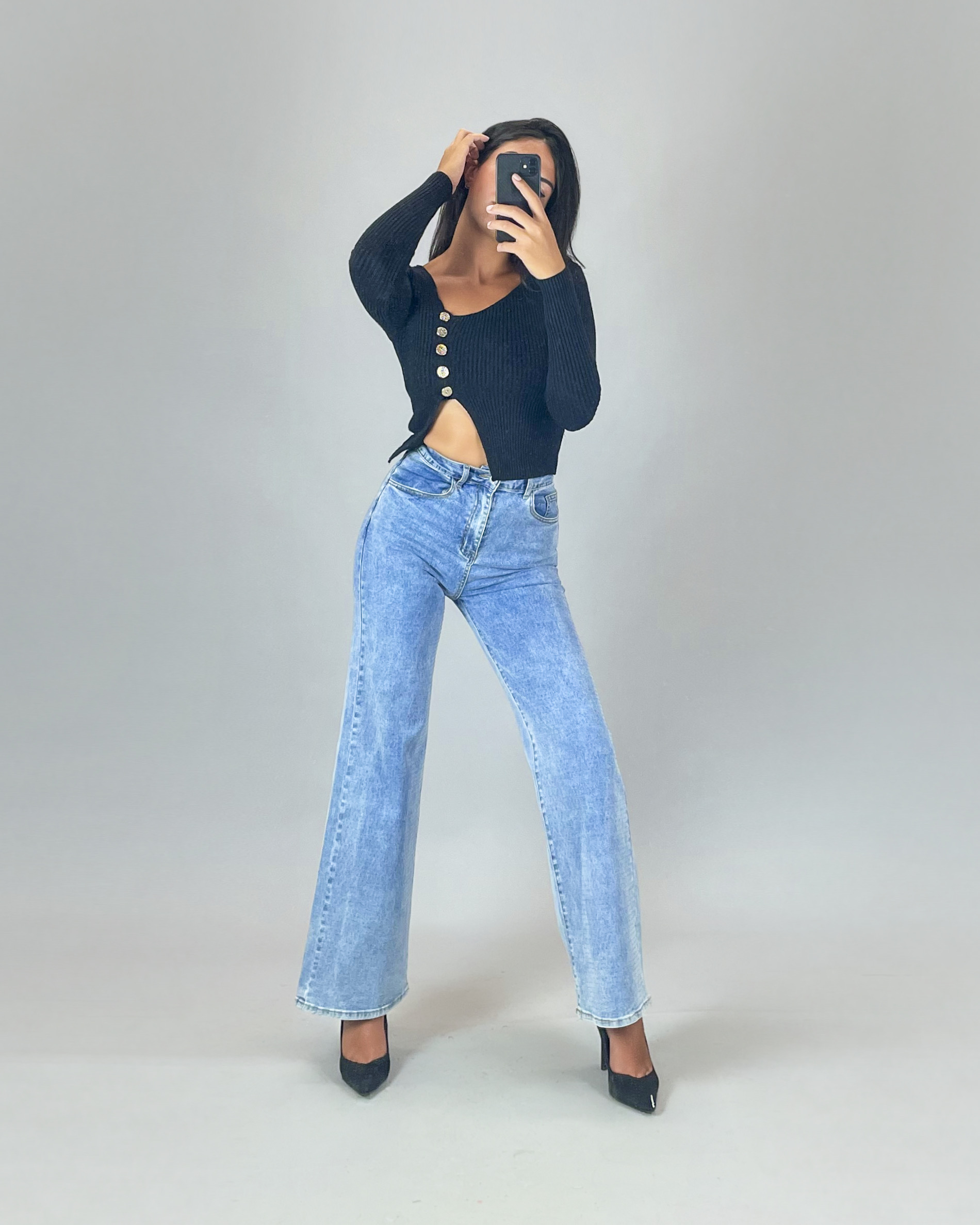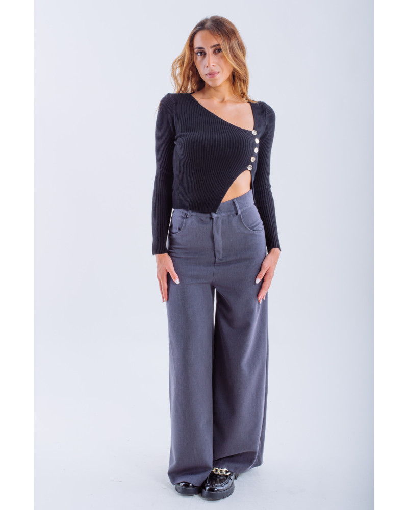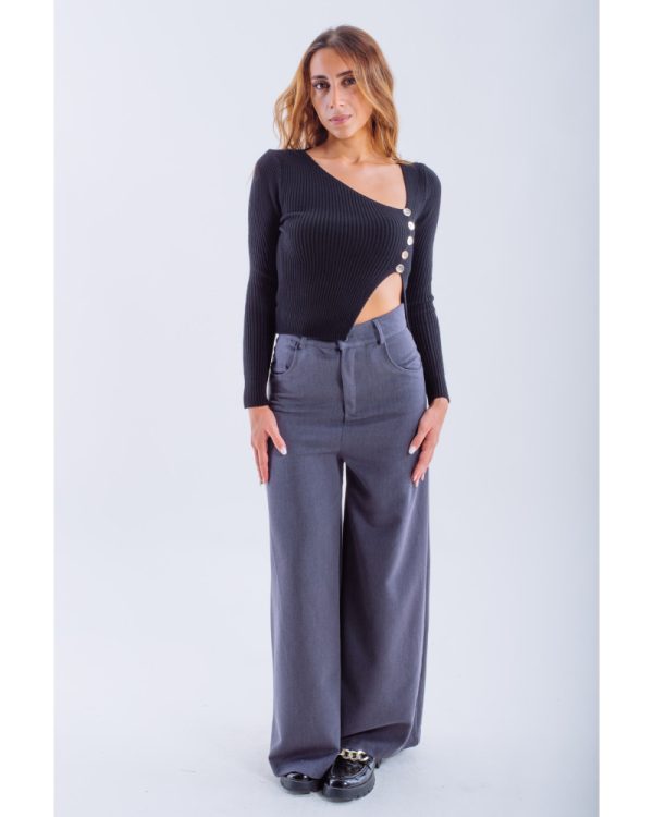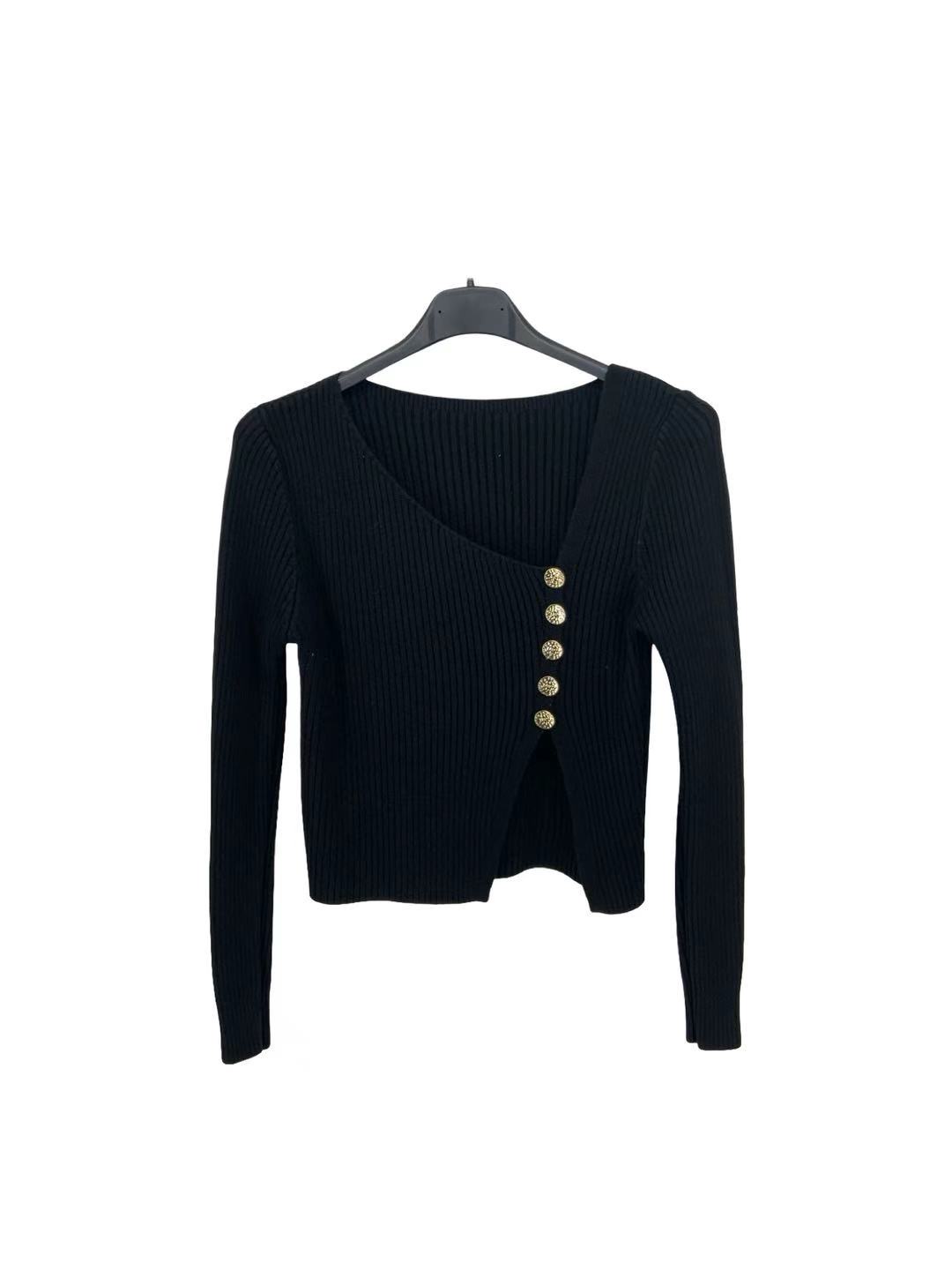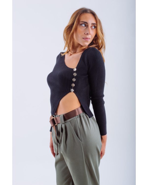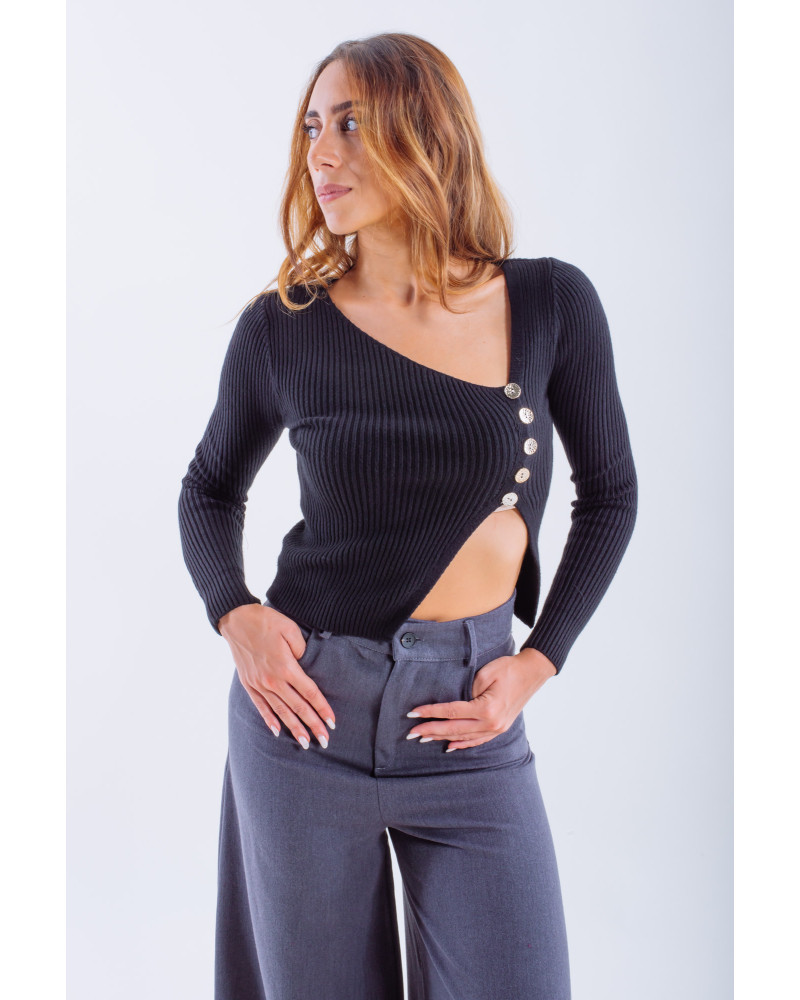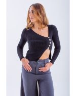 Asymmetric Ribbed Knit Top with Decorative Buttons – Black
