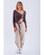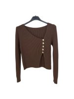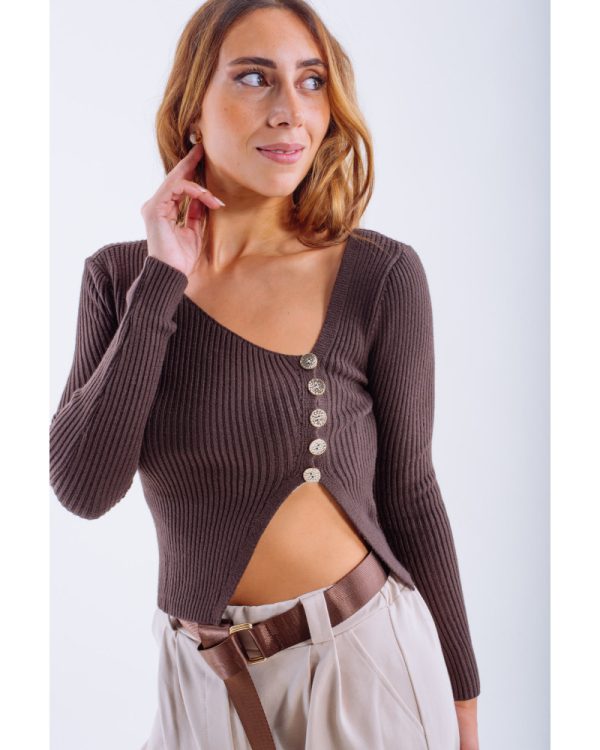 Asymmetric Ribbed Knit Top with Decorative Buttons – Brown