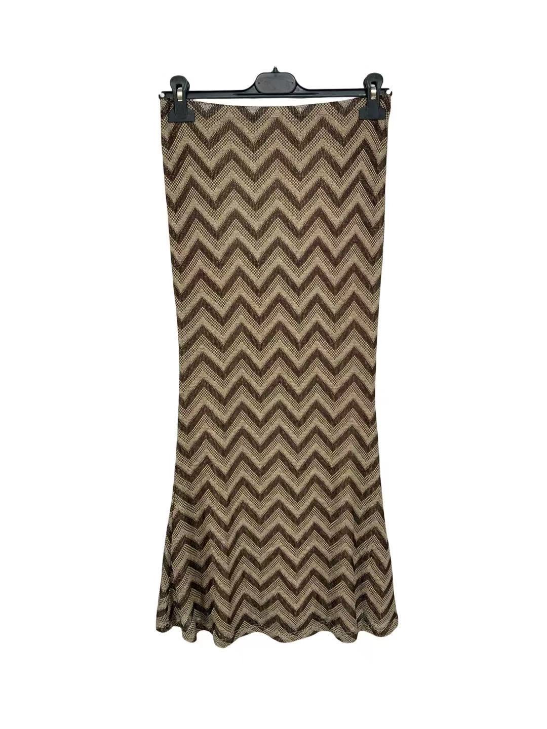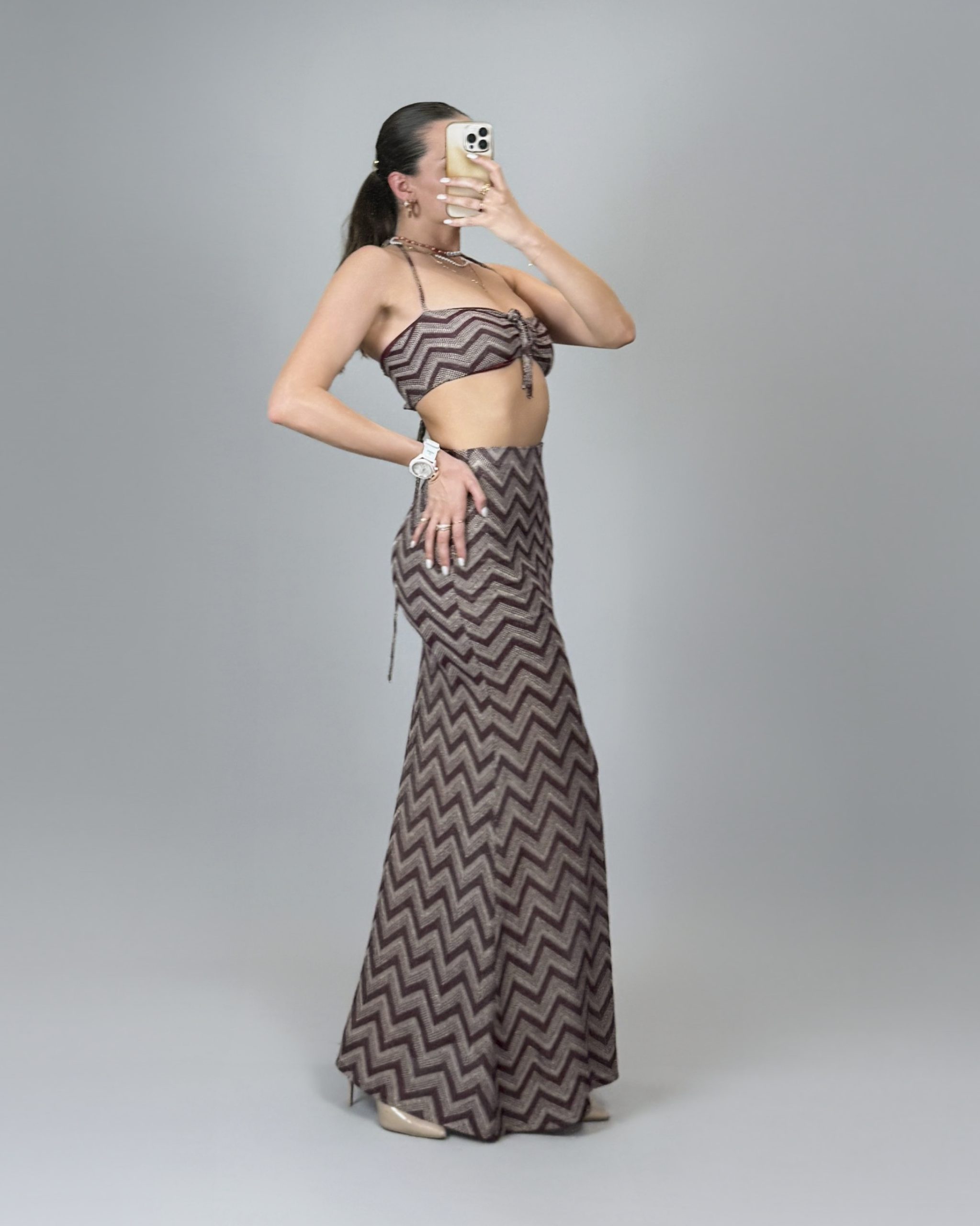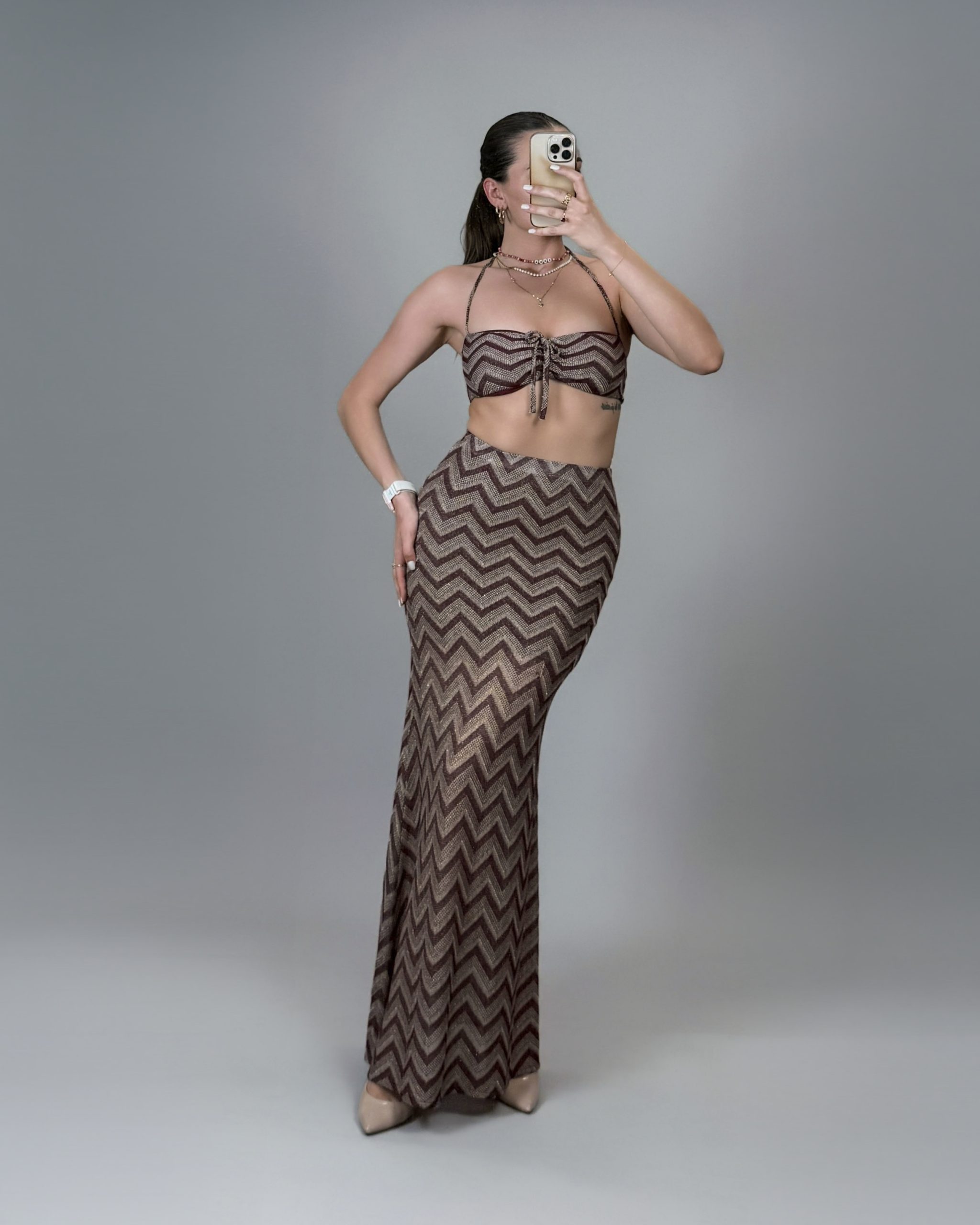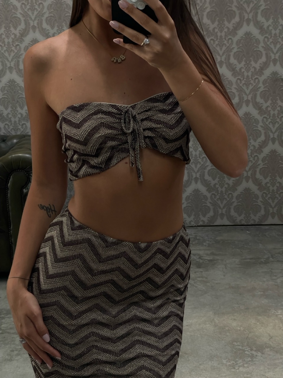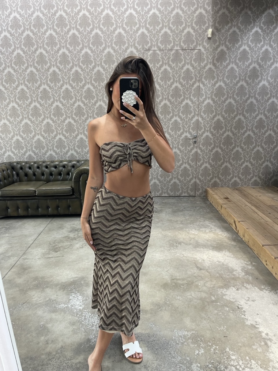 Complete set consisting of a chevron patterned crop top and long skirt.