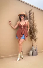 Satin Tie-Front Bell Sleeve Crop Top – Sky Blue