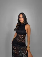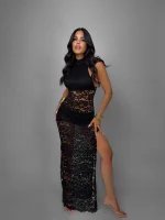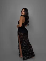 Lace High-Slit Maxi Dress with Gold Accents – Black