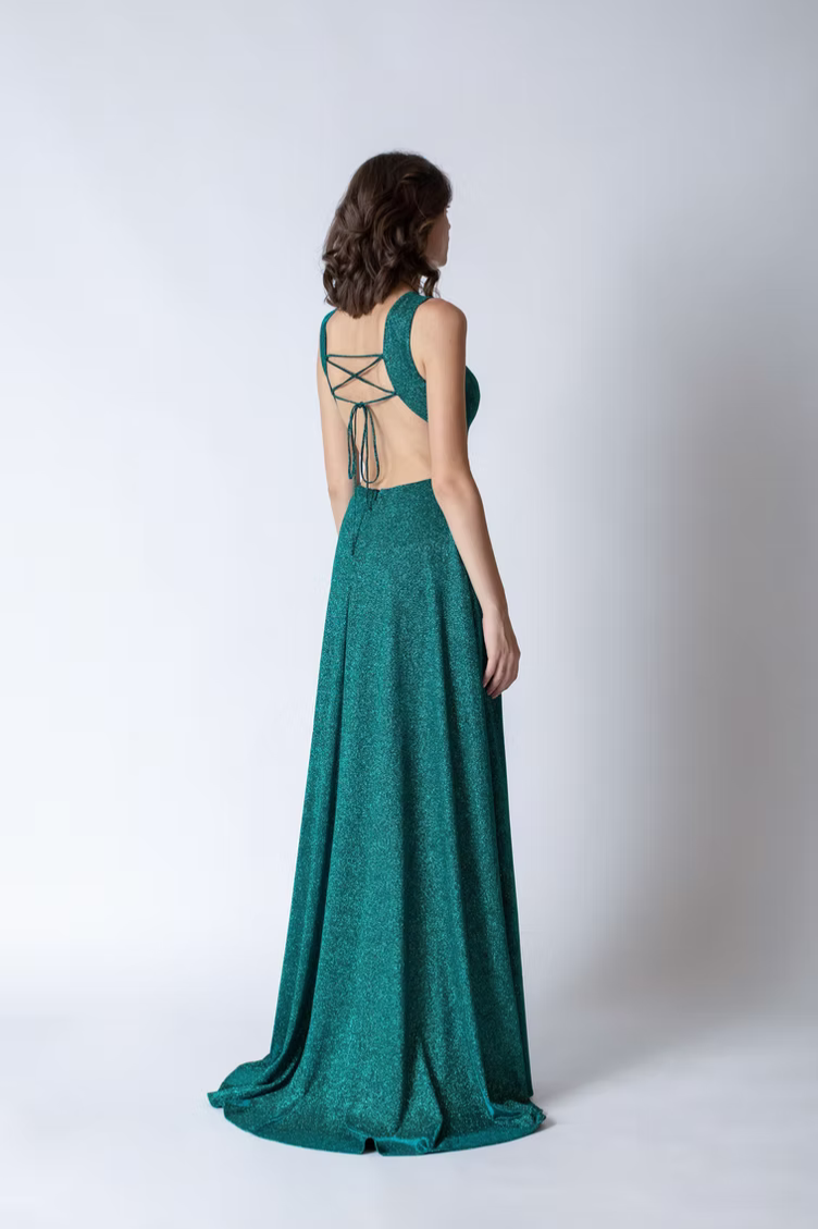 - Details: Crossed neckline, side cut-outs, deep slit, back fastening with laces