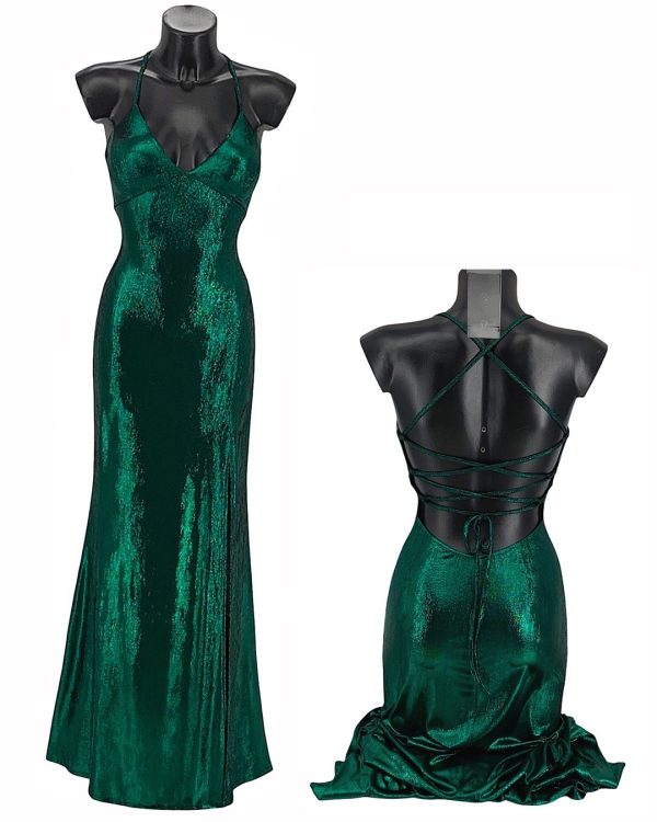 Metallic Cross Back Maxi Dress with Side Slit – Green