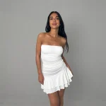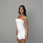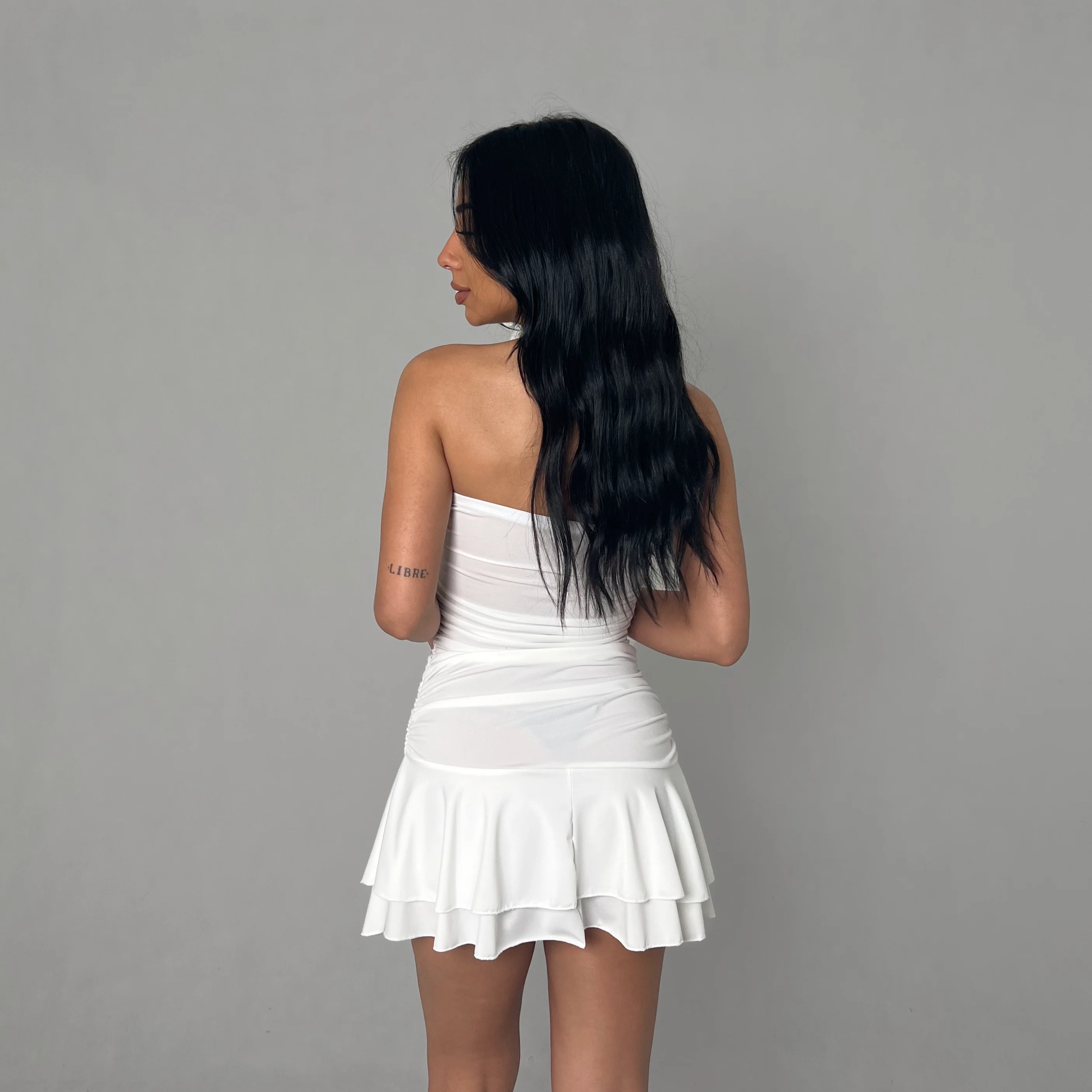 Short bandeau dress with flounced skirt. Ruched on the sides of the dress.