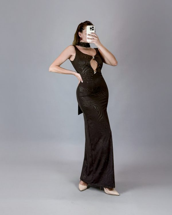 Patterned Maxi Dress with Gold Accent Detail – Brown