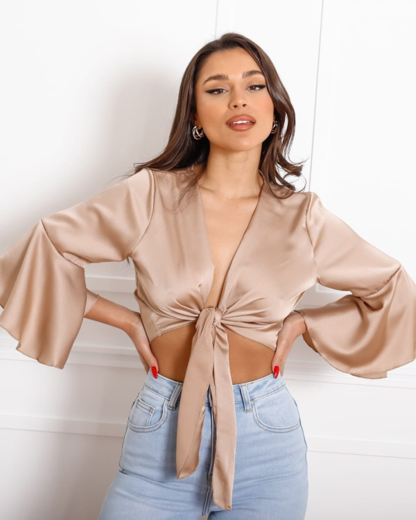 Satin Tie-Front Bell Sleeve Crop Top – Sky Blue