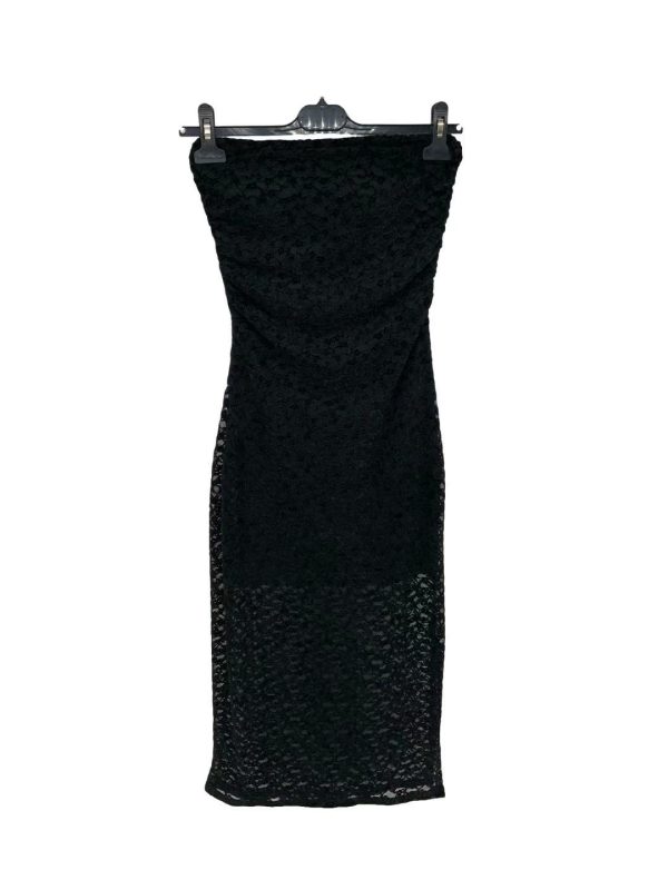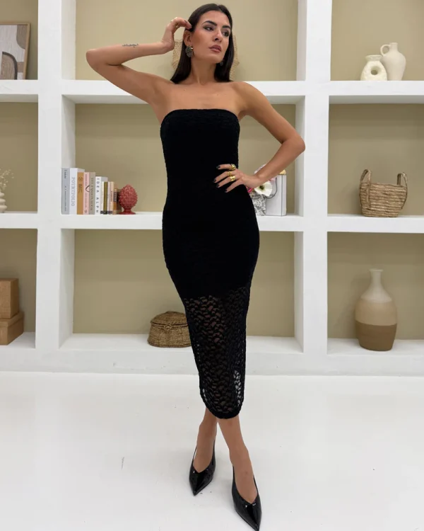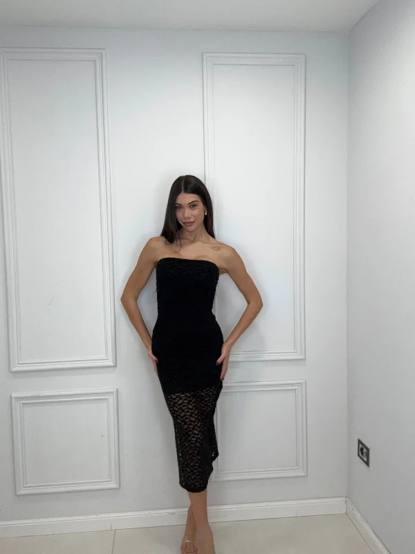 Strapless Lace Bodycon Midi Dress – Black