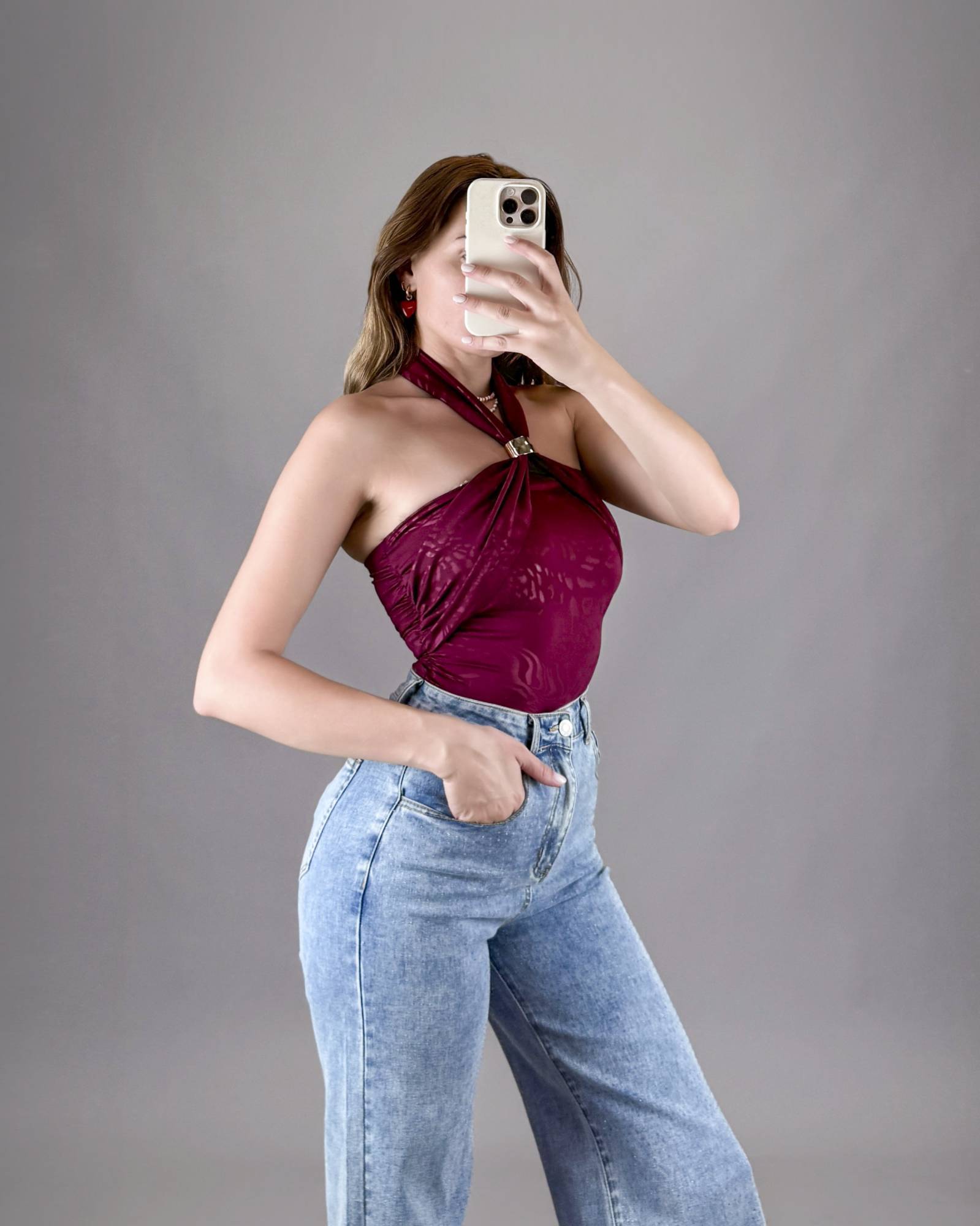 Bodysuit with halter neckline and gold accent detail, made from premium patterned fabric.