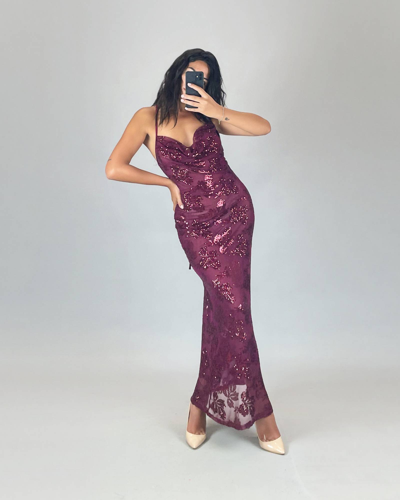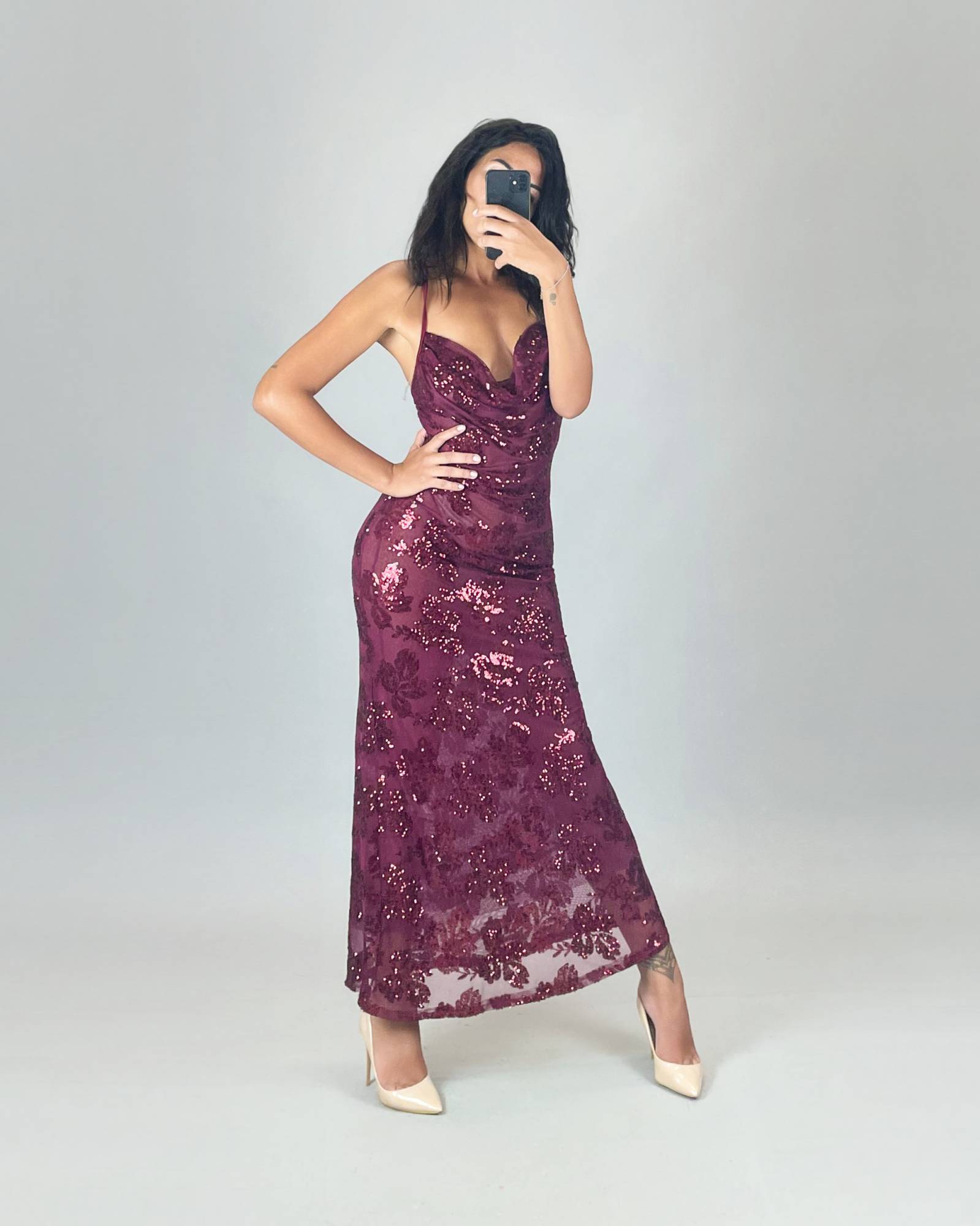 Sequin Maxi Dress with Open Back Design - Bordeaux