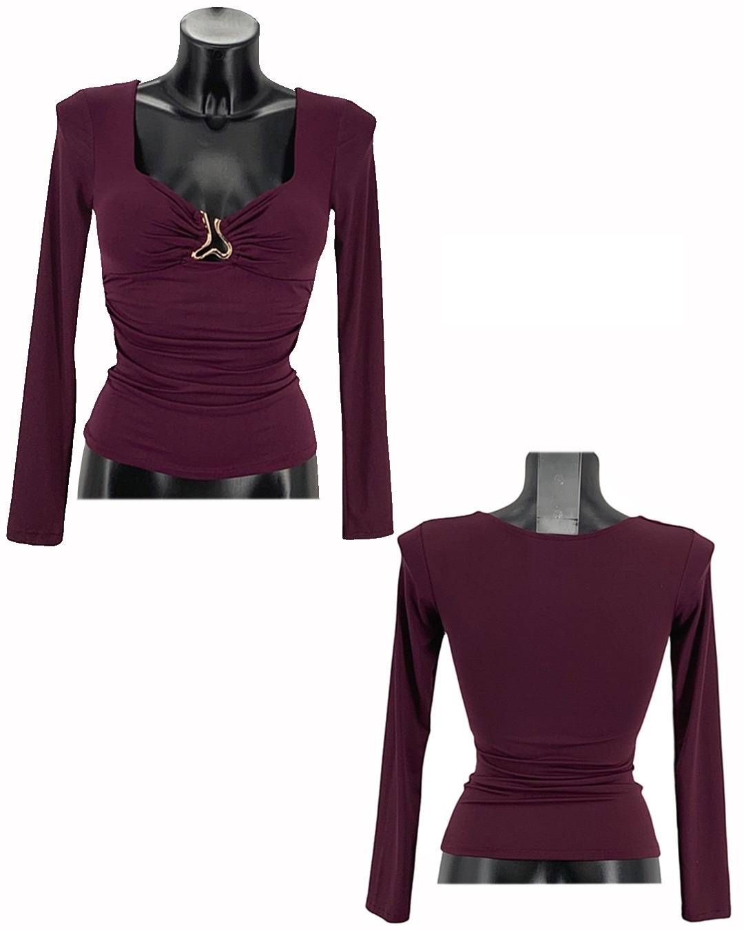 Long-sleeve ruched top with gold accent.